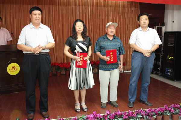 臨沭縣副縣長(zhǎng)李真(右一)、董事長(zhǎng)高文班(左一)為一等獎(jiǎng)作者頒獎(jiǎng)