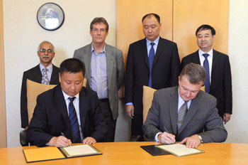 9月26日下午,總裁高進(jìn)華(前左)在普渡大學(xué)與農(nóng)學(xué)院院長艾卡雷杰教授簽署技術(shù)合作協(xié)議