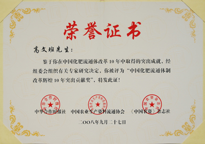 董事長高文班榮獲中國化肥流通體制改革輝煌十年個人突出貢獻(xiàn)獎