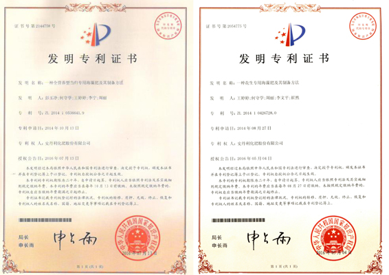 公司2項(xiàng)海藻肥發(fā)明專利、2項(xiàng)外觀設(shè)計(jì)專利獲得授權(quán)