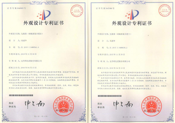 2項(xiàng)外觀設(shè)計(jì)分別為:包裝袋(硝硫基復(fù)合肥Ⅰ)(ZL201530489636.2)、包裝袋(硝硫基復(fù)合肥Ⅱ)(ZL201530489541.0)?!?/span>(行政中心 江廷雪)